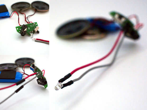 Este altavoz amplificador también tiene un pequeño LED azul para hacerle saber cuando está encendido. Con los altavoces se trasladan el LED podría haber sido obstruido. Decidí añadir largo conduce al LED por lo que pude colocar en la placa frontal con los altavoces.