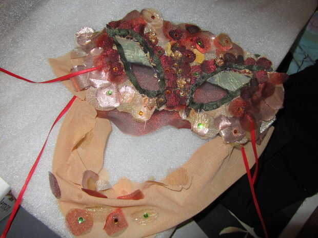 En la máscara de dragón de fuego corte escalas de diferentes tonos de pura y añade pedrería. La tela de color de piel es puro estiramiento malla y pone detrás de la cabeza. Hay lazos ocultos a cada lado por lo que se consumía en el pelo.