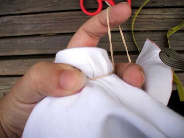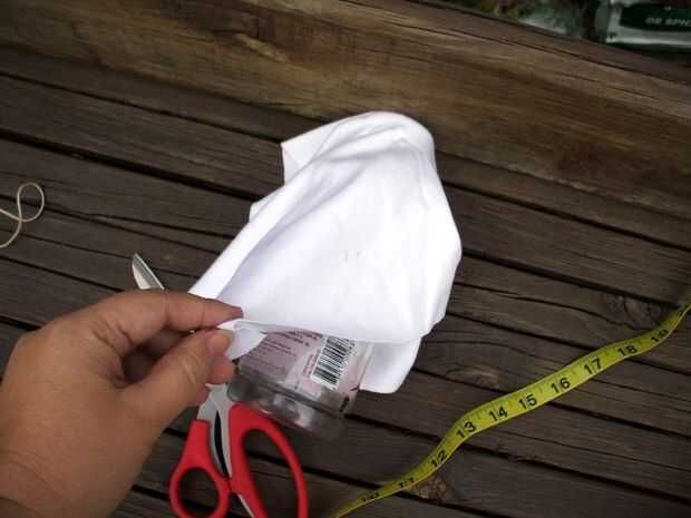 Cuelgue la tela uniformemente sobre el extremo de la tapa (otra vez, precisión no es importante) y fije la tela pasando una goma o cuerda alrededor de la botella justo debajo de la tapa. No es necesario estar super apretada, pero debe quedar ceñido.
