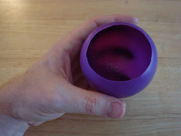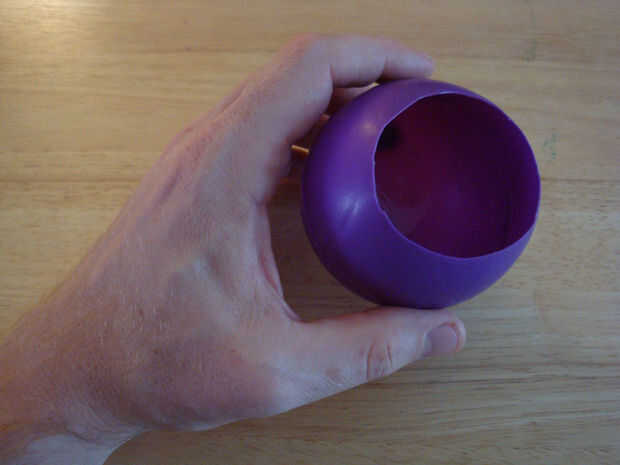 El primer paso es cortar aproximadamente 1/3 de la bola en la base. Desea mantener la forma redonda, pero deje suficiente espacio para colocar los componentes dentro. También corté dos rendijas para los ojos y un agujero en el lado opuesto del interruptor. Puede ver una pequeña abertura en la parte superior que asomó a través de modo que yo podría montar el gancho de ojo para colgar.