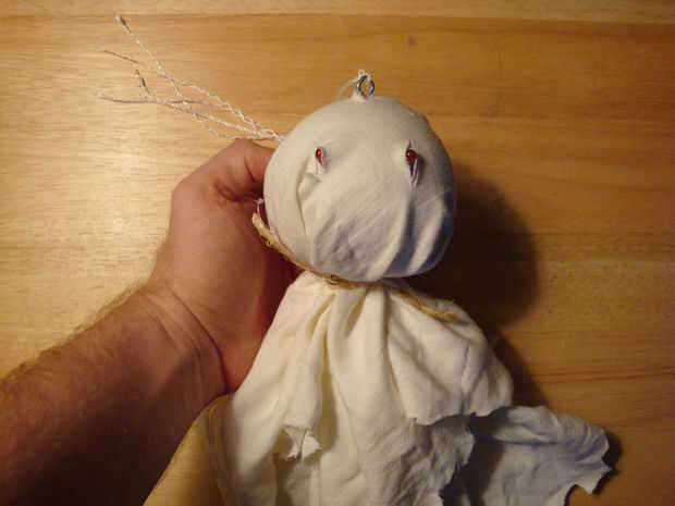 El paso final es la más fácil. Ponga los trapos en la parte superior de la bola y luego marque con un lápiz donde cortar las aberturas para los ojos y un agujero para el interruptor empujar de la parte posterior. Alternativamente, los LEDs no generan mucho calor, y sólo podría cubrir la bola entera. Los ojos brillan brillantemente a través de la tela (dependiendo del grosor).