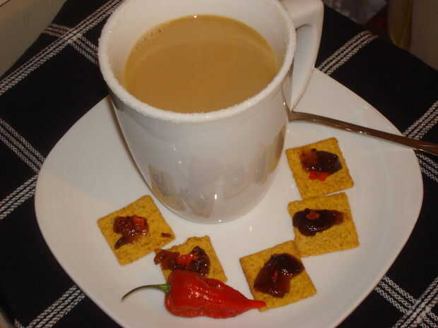 Esto puede servido con pan tostado o galletas con mermelada y rematado con una astilla de la pimienta del fantasma como se muestra.