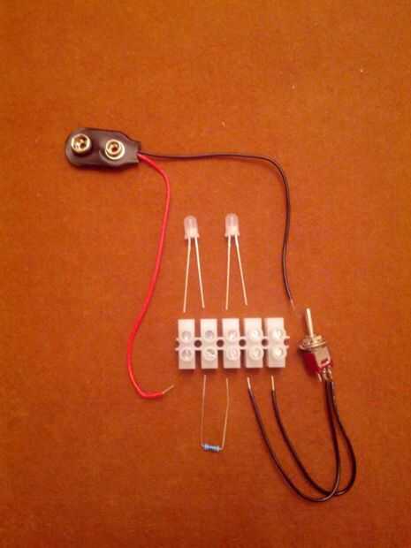 A través de la regleta, el primer LED se conecta a la resistencia se conecta al segundo LED se conecta al interruptor se conecta a la batería snap se conecta hacia el primer LED. Asegúrese de que el conductor rojo del cierre de la batería se conecta a la terminal enfrente el primer LED y el cable negro se conecta a la terminal enfrente del interruptor. Atornillar los bornes hacia abajo para que ninguno de los componentes del meneo. Es mejor si los cables están debajo de los tornillos en el bloque de terminales en vez de al lado de ellos.