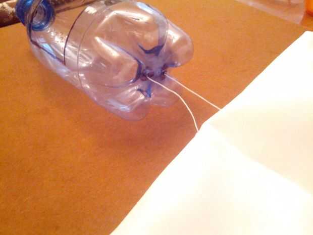 Una vez que el bloque de terminales instalado, será difícil hacer mucho dentro de la botella, así que es mejor sujetar la hoja de la tela ahora. Hay dos métodos que funcionan. Puede cortar dos pequeñas ranuras en la tela o enhebrar una aguja con la cadena. De cualquier manera, enrosque la cuerda a través de la tela, la botella a través de uno de los orificios en la parte inferior, hacia fuera a través del otro orificio y luego a través de la tela. Puesto que está sujetando la hoja a la botella, usted querrá la cadena para ir a través de la hoja en algún lugar cerca de la mitad, más o menos alineada con los orificios en la parte inferior de la botella. Después de que la cuerda se rosca a través de, unir los dos extremos de la cadena. Un nudo cuadrado funciona bien.
