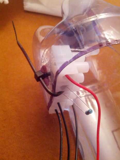 Inserte el cordón a través del agujero en la botella. Coloque el bloque de terminales en el biberón para que el cordón cae entre los dos pilotos. Alimentan el cordón a través del lazo de la resistencia. Asegúrese de que todo es más o menos en el lugar cerca de la amarra y tirar cómodo. Los LEDs deben ser más o menos niveles. Siempre puede hacer ajustes más adelante doblando los LEDs. Este paso es probablemente más fácil hacerlo si se desconecta la batería primero.
