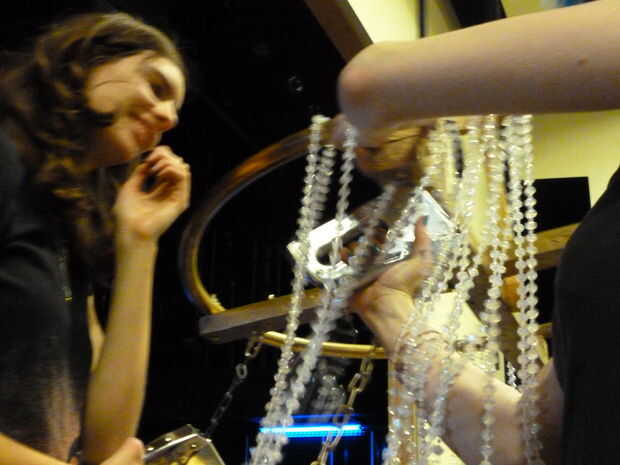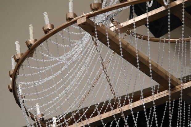 Volar su lámpara hasta una buena altura de trabajo, si no lo has hecho ya. Sacar las cajas y cajas de granos que, si eres como yo, sólo recientemente han sido enviado a usted una semana y media antes de la noche de apertura. Coge una pistola de grapas. Tome el extremo de la bobina de los granos de la parte superior hacia el interior del anillo superior de la grapa y cubra hasta los anillos medio e inferior, grapado a cada uno como van, ajuste de cuánto quieres a hundirse en el centro. En la parte inferior, cadena en el anillo inferior y llevarlo hacia arriba en el lado opuesto. Engrape los granos a la tubería por sujetar con grapa entre los granos, atrapando la cadena en la grapa y en contra de la tubería. Sus grapas no pueden ir muy lejos en el tubo, empujarlos si no lo hacen, no los quieren hacer estallar fuera de rendimiento medio. Repetir. Debe tener suficientes granos para ello cerca de 50 veces. Espacio hacia fuera para tener una hebra a cada vela y dos entre ellos.