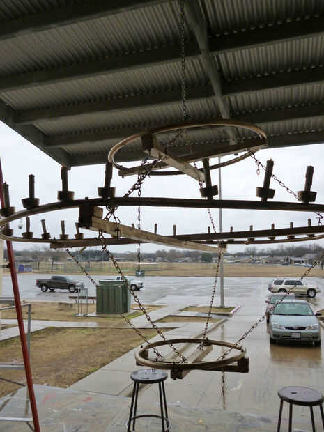 El siguiente paso implica el hardware costoso que compraste, no te preocupes, los pernos de ojo y eslabones de la cadena rápida se pondrá a buen uso. Llama tu ahora parece una serie de ruedas – Instale dos pernos de ojo en ambos lados de cada "hablaba" de la noria, 4-6" desde el extremo de las tablas, necesitas lo suficiente en que la cadena no se muestra fuera de los granos. En el anillo inferior, sólo Instale los pernos superior. En el anillo superior, instale todos los tornillos de la parte inferior y dos pernos de tapa en uno de los tablones. Fije todos los y luego poner un enlace de cadena rápida sobre cada perno de ojo. A continuación, tomar su cadena y dividirlo en 4 hebras, cada 8-10 pies de longitud (alternativamente, usted puede romper la cadena ahora en los 8 hilos diferentes necesita al final, pero no olvide de darse un montón de cadena extra en cada hebra para ajustes). Asegure la parte superior de cada hebra de uno de los cuatro cáncamos en la parte inferior del primer anillo, después a un cáncamo en cada anillo, para que todo está conectado entre sí y las armellas sólo dejadas desocupadas son aquellas en la parte superior del anillo superior. Los utilizan para volar la lámpara cerca de la tierra (fuera de si se puede, ver el siguiente paso) y hacer ajustes a la longitud de cada bit de la cadena por lo que es la altura deseada y colgar bastante nivel. Cuando esté satisfecho con el resultado, clip de la mayoría de lo extra y separar las hebras entre sí si todavía están conectados. Todavía recomendaría dejando unos enlaces extras en cada extremo, por si acaso.