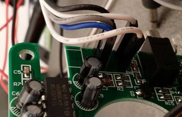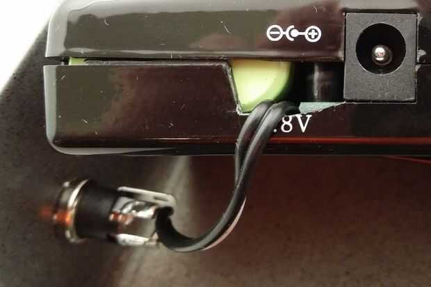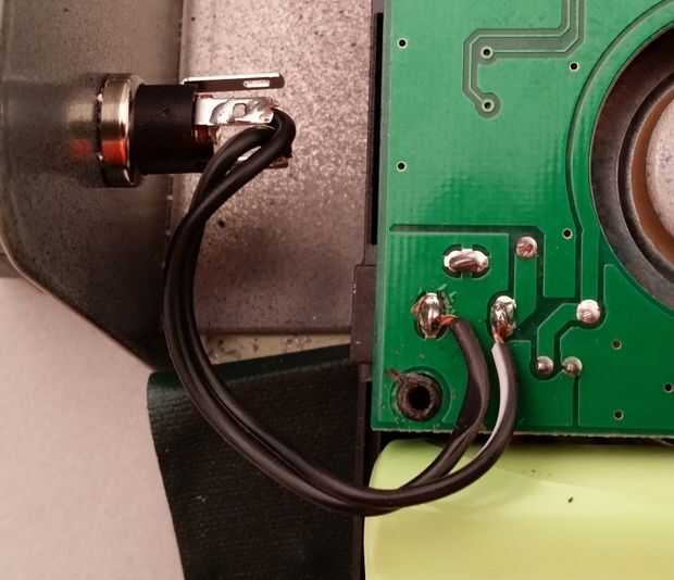 Al soldar dos cables en el jack de 2,1 mm (no use el interruptor). Luego suelde los cables a los conectores apropiados en la parte posterior de la placa de circuito donde están las conexiones jack. La conexión de la punta en el circuito es el más alejado de la cara. También necesitará una sección pequeña de la caja de plástico para los cables que salen del clip. Tenga cuidado de no atornille a través de los cables cuando se pone el caso volver juntos.