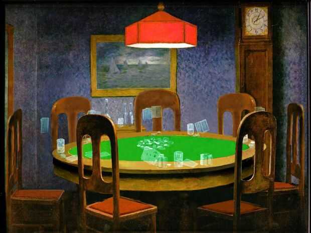 Hice esto con un poco más finura por recrear capas de chips, tarjetas y perros por separado y luego ellos crean separtely así, pero para esto puedes hacerlos todos en una sola capa. Si los haces por separado tienes que reconstruir algunas de las tarjetas y chips que se encuentran bajo las patas y unos trozos de pata de perro detrás de las cartas. Esto se hace sólo por encontrar las piezas que son imágenes de espejo, o sólo la clonación. Mismo proceso como lo hizo para recrear los respaldos de la silla.