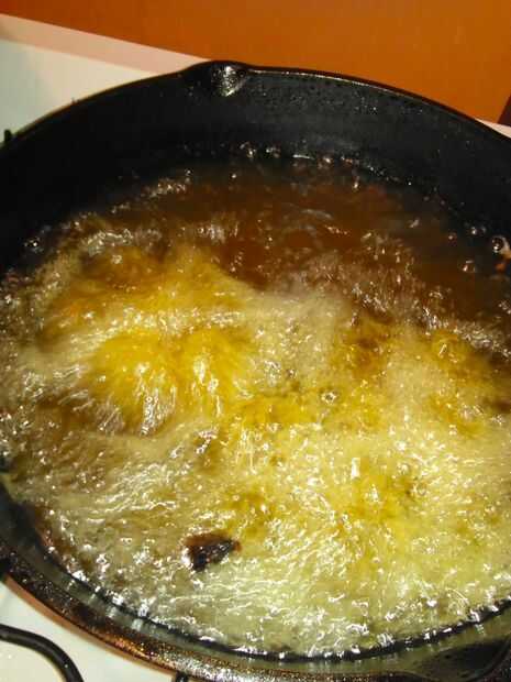 A la hora 1 y media marcar Inicio calefacción aceite de maní en una olla grande de hierro fundido. Llene la olla con aceite de maní hasta que el aceite es de aproximadamente tres pulgadas desde el borde. Calentar el aceite hasta que la temperatura llegue a 350 grados fahrenheit.