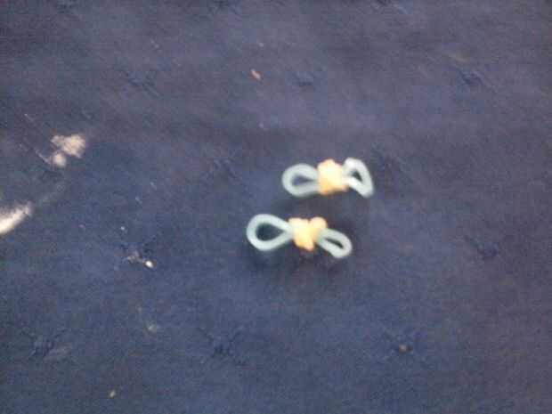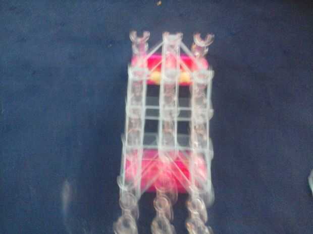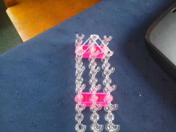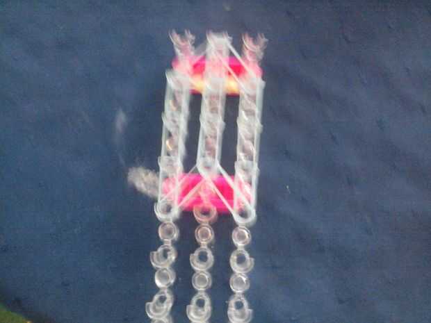 tomar sus dos primeras bandas y colocarlos como un triángulo en la parte superior de la Junta. bajar tres bandas y luego hacer un triángulo sin fondo en la parte inferior. luego gire sus bandas ojo alrededor de una banda del cuerpo cuatro veces. luego colocarlos en la parte superior, justo debajo del strech triangle.then una única banda en los ojos y una vez debajo de ése. Esto es lo que mantiene juntos.