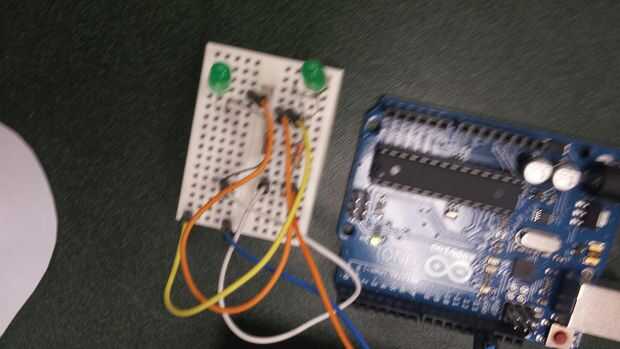 Debido al diseño de mi programa, corrí mi cable positivo del puerto 13 en mi tablero de pan. Esto entonces viajó a través de dos configuraciones de resistencias de 330 Ohm y LEDs en paralelo. Usando una tabla de pan, este montaje se demuestra en la primera imagen. El cableado es simple y preliminar, que también es ideal para los niños. Usando una tabla de pan simplifica aún más. El Arduino debe ser conectado a una fuente de energía, y debe también haber el programa subido a él. En la segunda imagen se pueden ver la conexión de la batería y la conexión a la computadora con el código.