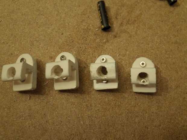 Perforaciones para fijar al cuerpo del quadcopter. Débilmente se puede ver en los dos a la izquierda un agujero más pequeño ha sido medio molido en el el lado del agujero más grande para dar cabida a los cables que necesitan para venir a través.