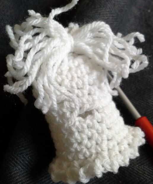 Tomar algunas hebras de hilo, doblarlas en la mitad y cortarlas, doblarlas otra vez en la mitad y cortarlas. Ate para arriba y sujete a la parte superior de la cabeza como se muestra en la foto con una aguja.