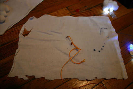 Materiales* Dos tiras de trapo blanco de aproximadamente 12 pulgadas de ancho.* Una bola plástica flexible (aproximadamente del tamaño de un beísbol con pelota blanda).* Unas tiras de hilo o cadena.* Una resistencia de 1K (1.000) Ohm.* Dos LED ' s ro