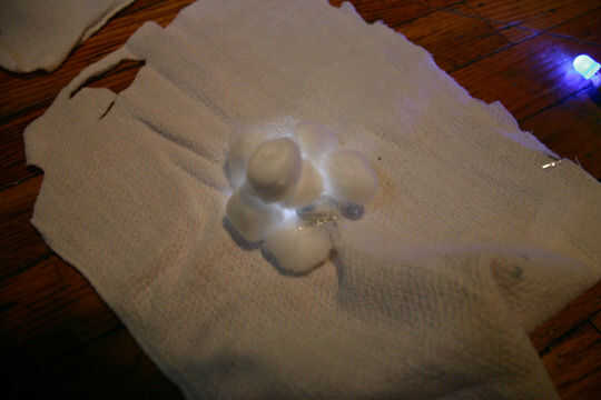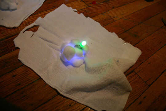 Hacer algunos LED throwies menos los imanes. Insertar LEDs a través de los dos orificios superiores o simplemente añadir bolas de algodón.