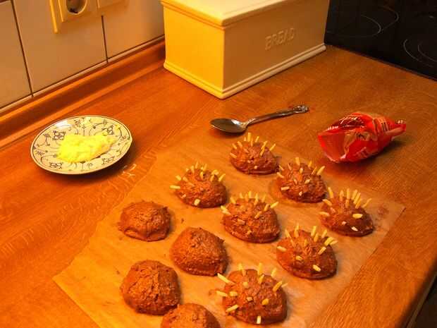 Ahora tienes que poner la crema encima de la shortcrusts. Simplemente tome una cuchara y forma los hedgehogs, si youre, pegar palitos de almendra en los erizos que tienen púas. Ahora tienes que poner en la nevera durante una hora.