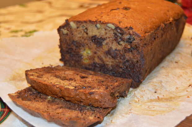 este es un dulce regalo. Chocolate y plátanos son uno de mis combos de sabor favorito y ya que la Navidad es vuelta de la esquina, me decidí a hacer una prueba para ver cómo esta receta sostendría en un pan de forma festiva en lugar de la perforación