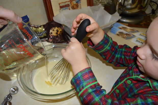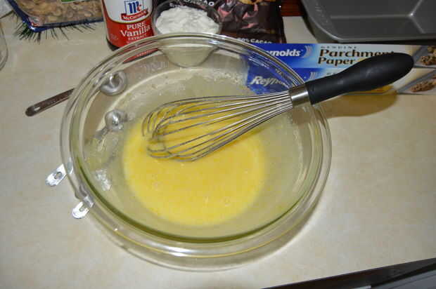Batir los huevos brevemente, luego agregar el azúcar poco a poco. Continuar a batir la mezcla hasta que la consistencia es esponjosa. Esto puede tardar hasta 10 minutos. Salpicar en el aceite, mezclar bien.