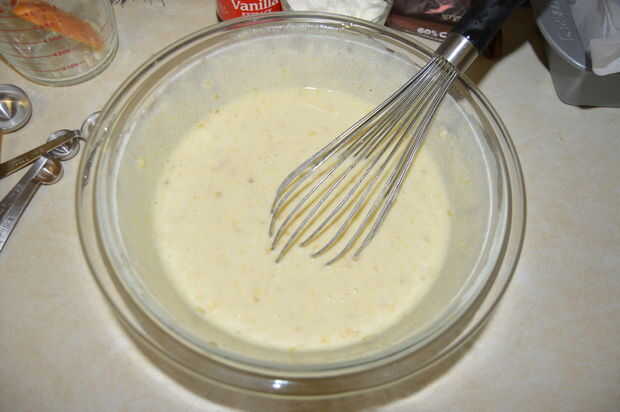 En un tazón grande, puré de plátanos 3-3 1/2 hasta consistencia uniforme. ~ O sólo pueden hacerlo a mi manera, aplastar hasta en tus manos (recién fregadas limpias, por supuesto!) sobre el tazón de fuente de mezcla de huevo/azúcar y sálvate a ti mismo un plato extra a Washington ~ añadir el puré de bananas, la crema agria y la vainilla a la mezcla de huevo/azúcar. Mezclar.