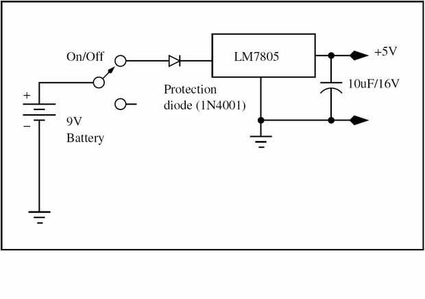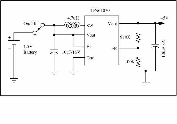 Derivar + 5V para el funcionamiento de dados, un convertidor DC-DC de tipo adecuado debe ser utilizado. Figura ilustra un + 5V fuente de alimentación conveniente para la operación de dados desde una batería de 9V de la pared y la otra figura muestra el diagrama esquemático para un + fuente de alimentación de 5V de una 1.5V baterías de tipo AA o AAA con un TPS61070 DC-DC convertidor.