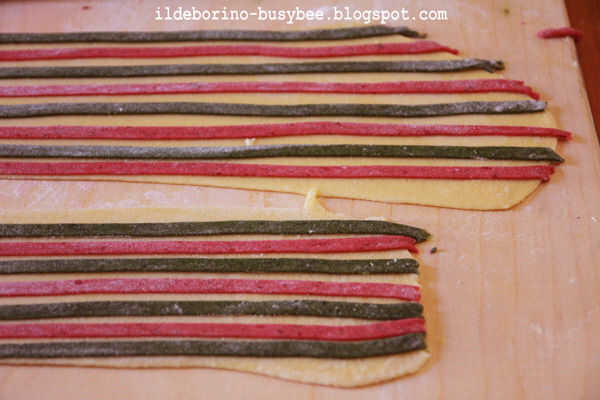 Humedezca la masa básica del huevo con un poco de agua y colocar los tallarines en la base alternando los colores Presione ligeramente con los dedos para que los tallarines se peguen a la base. Cortar las tiras de pasta color exceso.