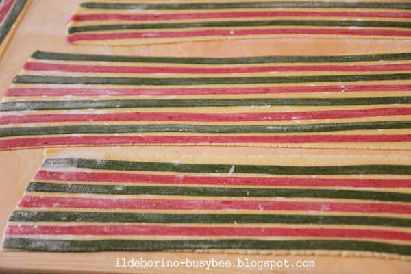 Aplanar la masa con la máquina de pasta o rodillo, hasta que quede a pocos milímetros de espesor. En mi máquina que es logrado pasando la masa por el segundo antes de último ajuste. Usted tendrá que obtener una hoja de pasta suave donde las rayas coloreadas se convertirá en uno con la base de la masa.
