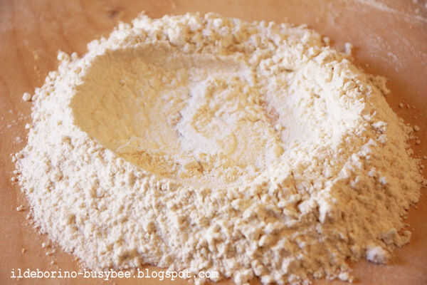 Verter la harina sobre una superficie de trabajo y hacer un pozo.
