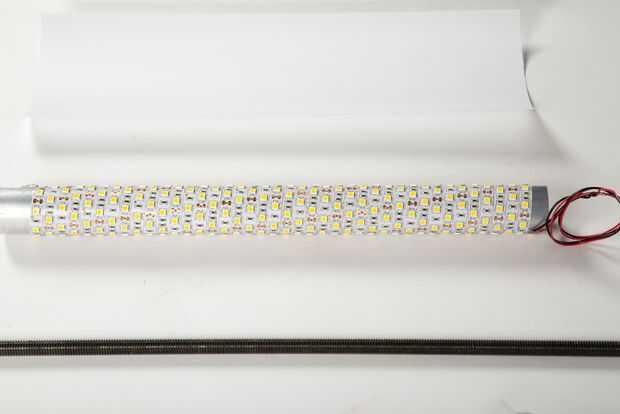 El tubo de aluminio de la iluminación fue bastante simple. Tomé el tubo de aluminio compré de McMaster, medido, había cortado en la sierra fría y luego envuelto luces alrededor de él. Para asegurarse de que los extremos de las luces me alojé en el tubo, he utilizado una cantidad gratuita de cinta de doble lado (además el adhesivo de respaldo ya en las luces).