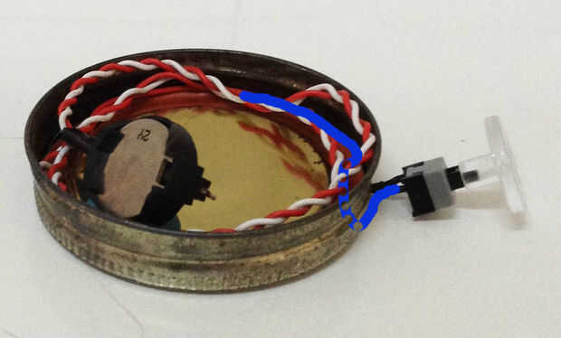 Asegure el faro cracker en la tapa interior del anillo de alambre. Ya que quería el faro un poco más alto, hice una taza toilet-paper-roll-and-stiff-paper similar al que sostiene el LED y lo boca abajo en la tapa con cinta. Luego, pegué el faro en la parte superior con mantequilla de maní.