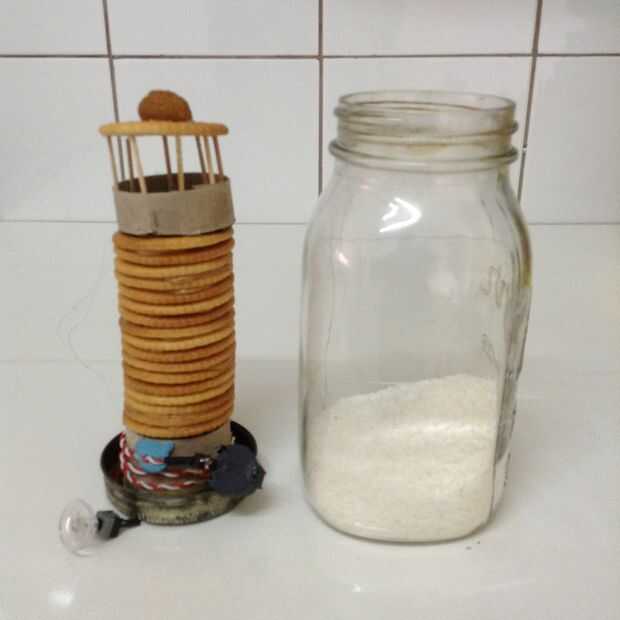 Asegúrese de que todas las partes del faro firmemente pegado juntos con mantequilla de cacahuete, como vamos a tener que tener que mantener el faro horizontalmente para entrar en el tarro.