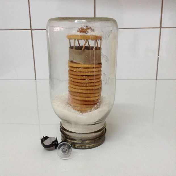 Llenar un coco en la jarra y coloque la jarra en el lado. Sosteniendo el faro horizontalmente, insértelo en el tarro (yo usé un cuchillo para apoyar el faro), tornillo de la tapa y configurar el faro así que cae la nieve en la parte inferior.