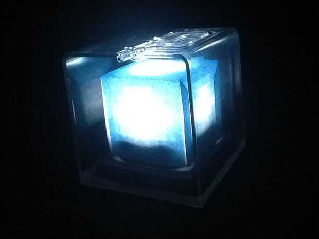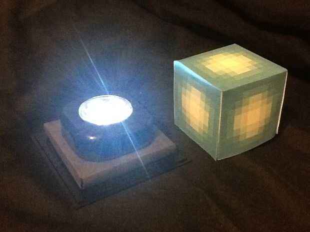 aquí es un modelo pequeño que brilla intensamente de una baliza del juego Minecraft.  La luz proviene de un proyector LED barato.  El LED, baterías y el interruptor están en la base (la parte cubierto de cinta aislante negra, hecha de una hoja de alu