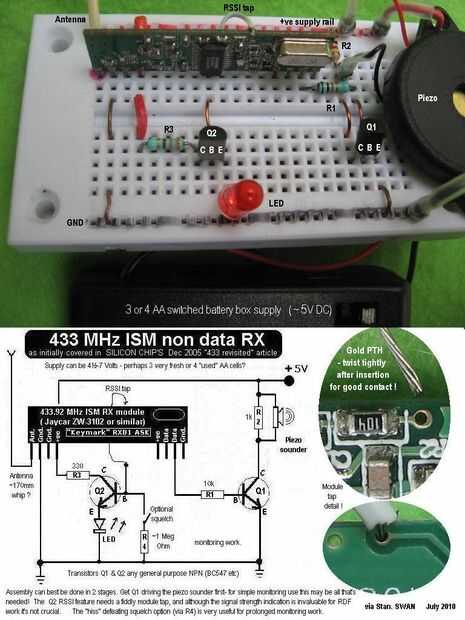 Un escáner de frecuencia ultraelevada o radio de jamón ($$-$$$) juegos de recepción del localizador, pero para presupuestos ajustados y modesto necesita considera un receptor simple "sniffer". Aparte de uso aquí, estos pueden ser muy útiles para una variedad del dispositivo 433 MHz comprobando como bien inalámbrico timbres, estaciones meteorológicas de patio trasero, contadores etc. Salida del receptor compañero pregunte Keymark RXB1 puede fácilmente conducir un piezo sonda cuando simplemente NPN impulsado, y un grifo RSSI indocumentado incluso puede ser útil. Ver detalles = >http://www.picaxe.orconhosting.net.nz/433rx.htm