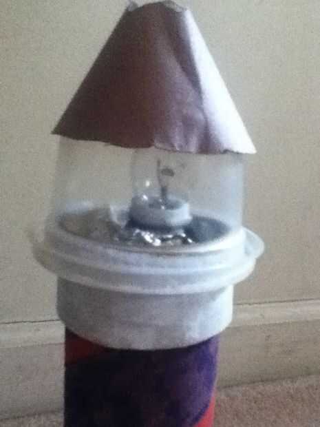 aquí es un modelo pequeño que brilla intensamente de una baliza del juego Minecraft. La luz proviene de un proyector LED barato. El LED, baterías y el interruptor están en la base (la parte cubierto de cinta aislante negra, hecha de una hoja de alu