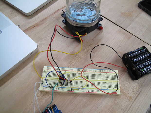 El video de arriba muestra las primeras etapas de prototipos el interruptor táctil capacitiva. El sqaures de tarro y espuma de bola son un suplente para el producto final, hacen un gran trabajo de ilustrar la animación que va a suceder en la pieza acabada. Aunque la tela conductora actúa como suplente para el interruptor actual, es fácil imaginar que si fueron enganchada a la tapa metálica del frasco, actuaría de la misma manera.
