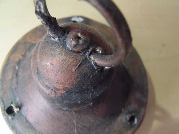 Asegúrelo con un tornillo en la parte superior. Perfore dos agujeros en la tapa casi horizontal. Doblar el anillo de metall un poco abierto (mina tenía un boquete) y colocarlo en los orificios. Apriete para que sea meter en los agujeros. Un poco de pegamento no está prohibido.