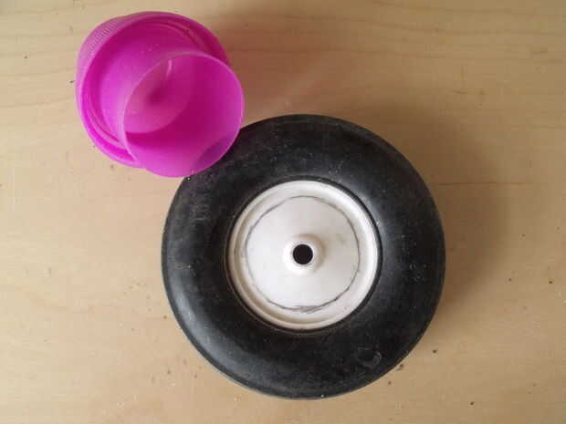 Marque el tamaño de la tapa en la base de la rueda. Perforar varios agujeros al lado de uno y quitar el centro de la rueda. He utilizado una sierra de vaivén así. Crear un espacio que se ajusta cómodamente alrededor del borde de la tapa de la botella. Puede ser que un archivo va a venir bien. Din't necesita ningún pegamento. Permanece en su lugar sin más accesorios. Taladre dos agujeros de 6 mm en el lado de la llanta. Pegar dos pedazos de varilla de 6 mm, 7 cm de largo. Estas piezas de varilla será la conexión a las placas de pared.