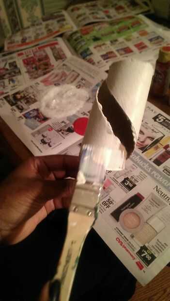 Clip de una clavija para el rollo de papel y pintura exterior del papel higiénico del rodillo blanco y el interior del papel higiénico del rodillo decorativo color (rojo, verde, azul, etc.) de la pintura de su elección. También puede cortar el rollo de papel antes o después de pintarlo (opté por cortar el rollo de papel primero antes pintando).