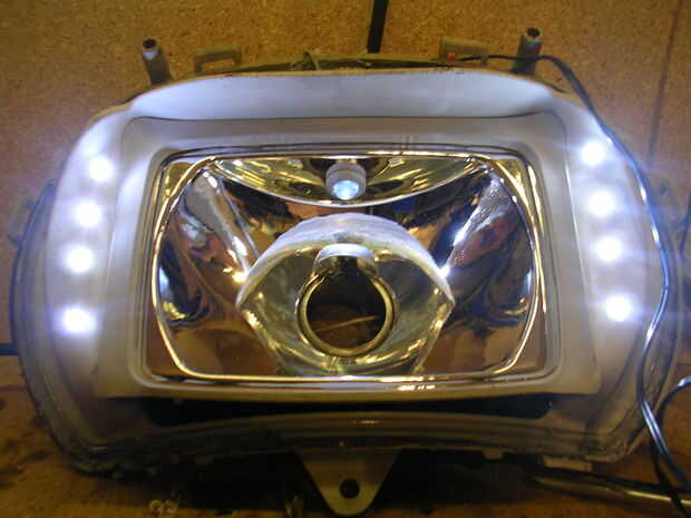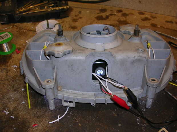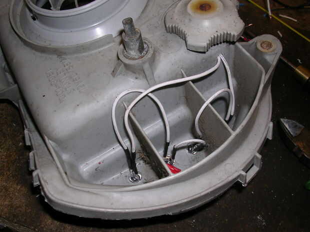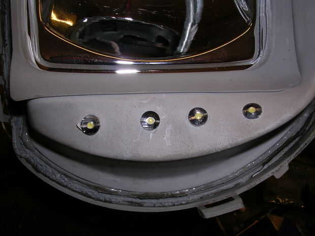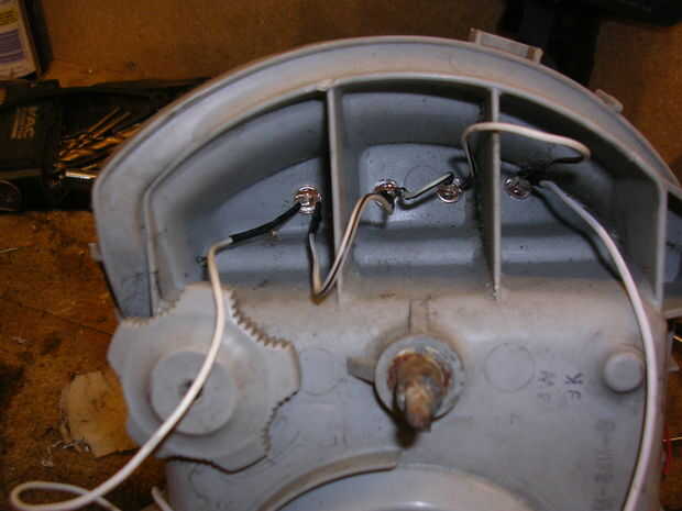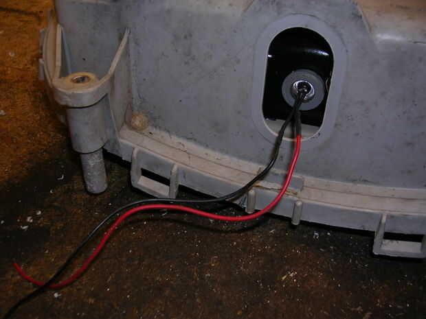 Saque los cables por el orificio de acceso para el "lado de la luz" para hacer las conexiones. corte de la bombilla vieja y soporte y conecte los cables a sus grupos de LED. Utilice una fuente de alimentación de 12 voltios para comprobar la polaridad de los LED antes de hacer la conexión eléctrica final. Asomó también un LED de 10mm con una resistencia para funcionar a 12V en el agujerito el bulbo "lateral" solía ir. Que no hará mucho, pero llenará un hueco!