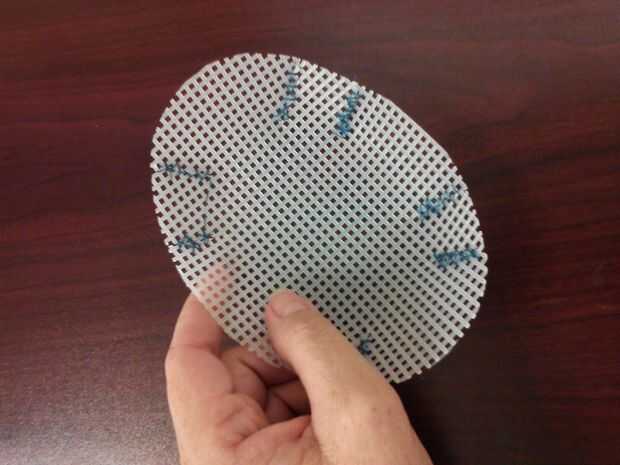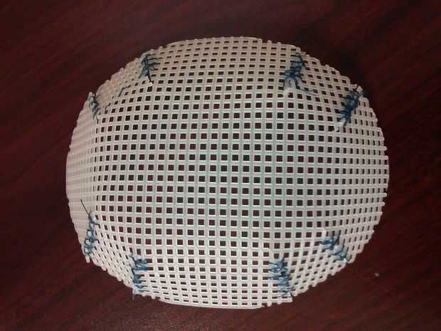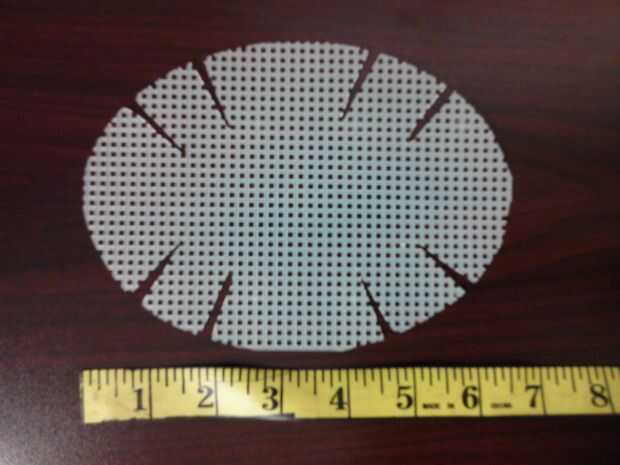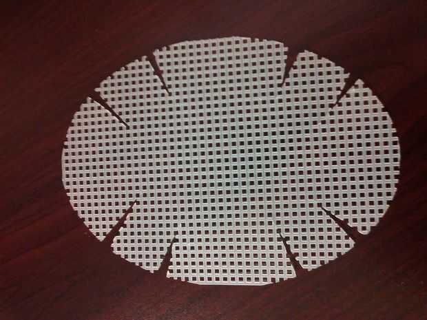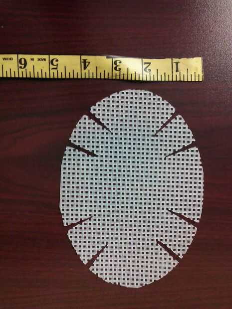 Cortar un óvalo fuera de la lona de plástico 4-1/2" por 6-1/2". cortar 8 ranuras, 1/4" de ancho por 1-1/2" de largo.