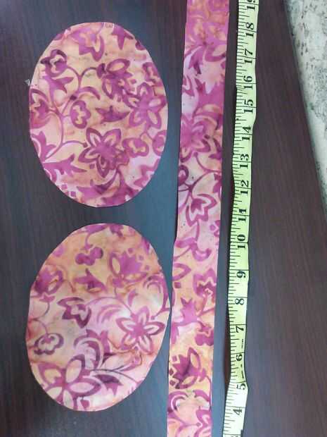 Cortar 2 óvalos de la tela pero no corte las muescas en éstos. Pin uno a la parte superior del sombrero y el otro debajo.