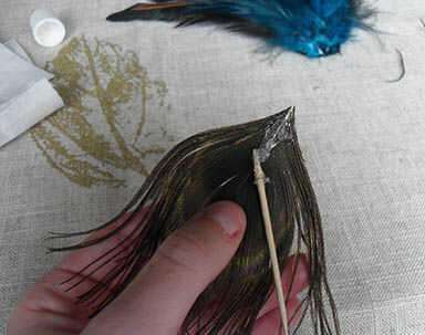 Aplicar adhesivo a la parte posterior de la pluma ojo. No tendrás mucho eje como guía en este caso. Se aplica un cordón de adhesivo que se extiende hasta un poco menos de medio camino en su área de los ojos. Tenga cuidado de no para utilizar demasiado pegamento, como no quiere empapar a través a la bloquea