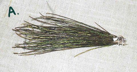 E) Saddle de gallo --más corto y más fino que plumas Grizzle, pero disponible en muchos colores brillantes. Éstos también tienen rebote agradable para ellos y son excelentes para este proyecto! Silla de montar plumas casi siempre confluyen cosidos en una tira larga y pueden ser comprados por el patio.