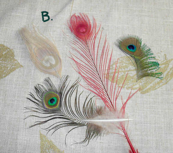 B) pavo real ojos --uno de las más populares plumas para tocados y joyería. Usted puede encontrar natural, blanqueado, teñido (disponible en muchos colores, salmón se muestra aquí) y mitad-espadas. Compra de plumas que se blanquean blanco en lugar de plumas de pavo real blanco natural, asegúrese de mirar de cerca la calidad de la pluma. Igual blanqueamiento excesivo puede debilitar a telas, puede debilitar la estructura de pluma. El blanqueado que se muestra aquí es notablemente más gruesa que las otras plumas y sería más probable romper si he intentado rizar los wisps.