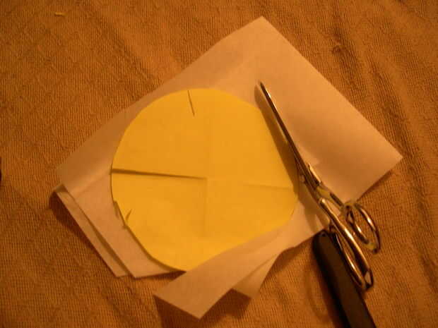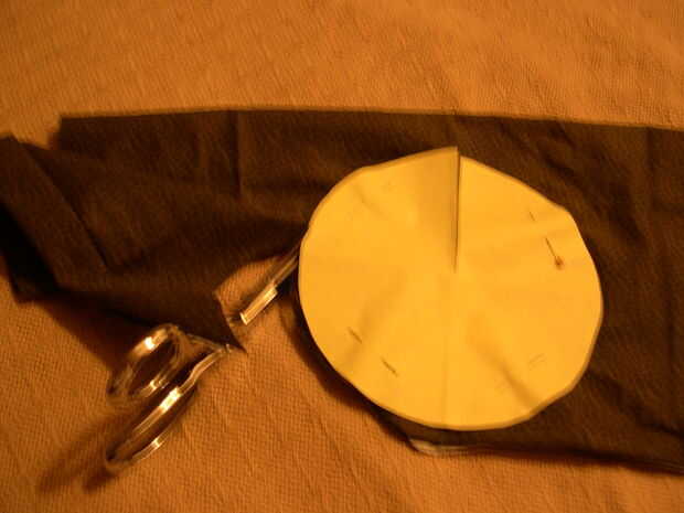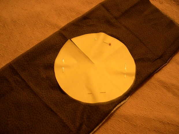 Doble material y pin en la pieza. Corte el material. Debe tener dos círculos de tela. Elija la interfaz más pesado que se puede encontrar. Usé el estabilizador del bordado. He leído acerca de personas usando cartulina o cartón, pero preferí este método. Cortar dos círculos. Uno probablemente habría sido suficiente.