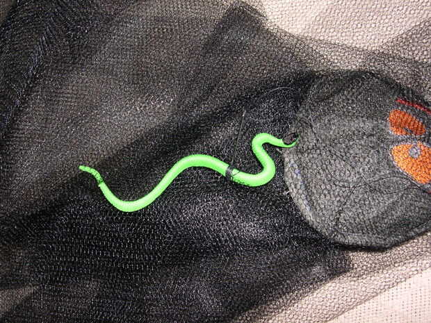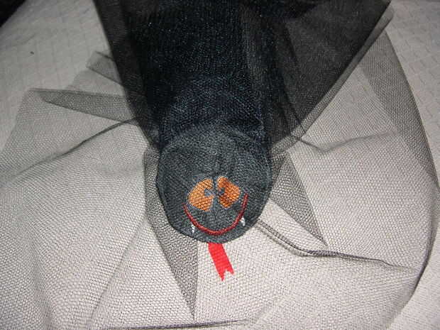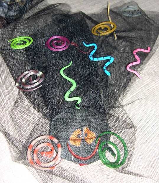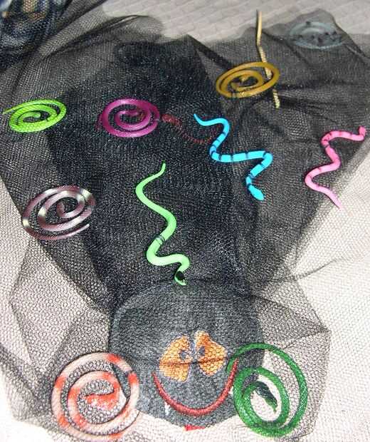 Expuso el sombrero con el velo repartido para determinar la colocación de las serpientes. Os adjunto las serpientes con hilo enrollado varias veces alrededor de los cuerpos. No intento forzar una aguja a través de los cuerpos de la serpiente.
