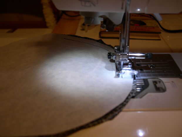 Doblar un dardo estrecha o triángulo desde el centro hasta el borde para dar el sombrero alguna forma posterior. Puntada de máquina o mano coser en su lugar. Si utiliza la máquina de coser, tenga cuidado. Se trata de grueso y sería muy fácil de romper o doblar la aguja (como yo).