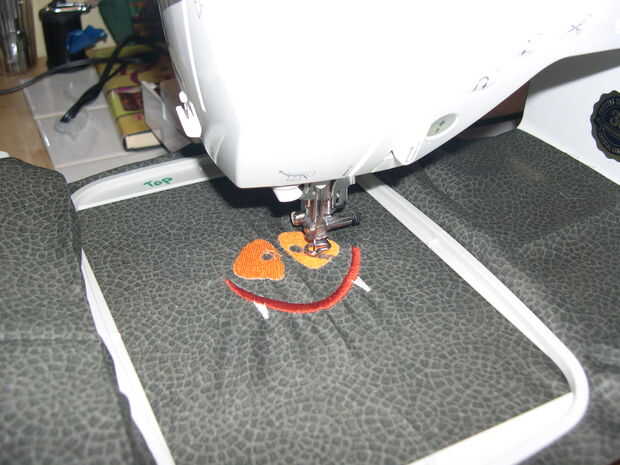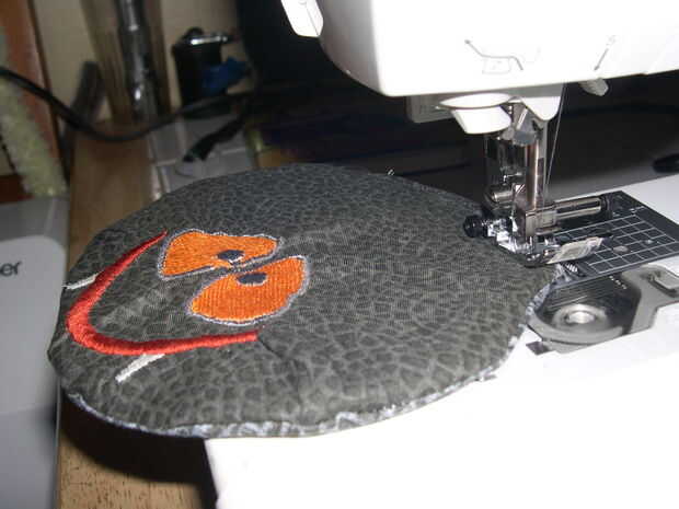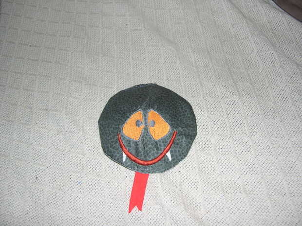 Me decidí a máquina bordar una cara de serpiente en mi sombrero, mi siguiente paso era que el material del aro y hacer el bordado antes de cortar el material. No recuerdo donde conseguí este patrón particular. Podría mano bordar una cara de serpiente cuando el sombrero está completado o para la cara en conjunto si lo desea. Hannibal decidía a supervisar.