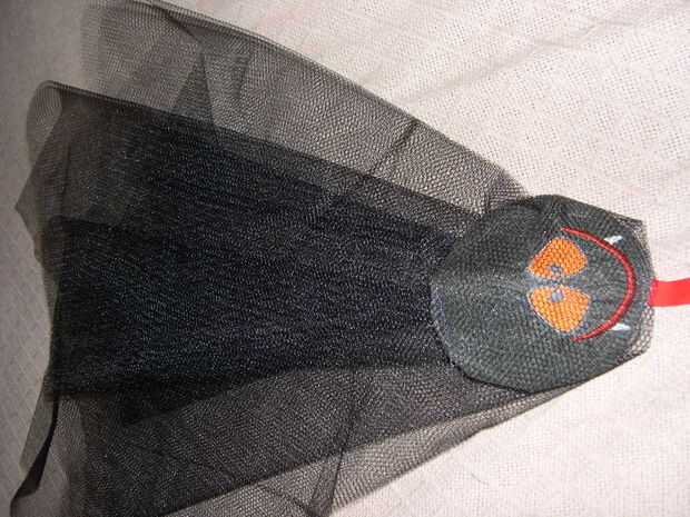 Me arregló los pliegues de la gorra y utiliza un perno de seguridad para mantener la red en su lugar. Utiliza hilo de botón para virar hacia abajo de la red y luego se retira el pasador de seguridad. Sacó un redil para volver sobre la cara como un velo. También podría colocar otro pedazo de tela como un velo.
